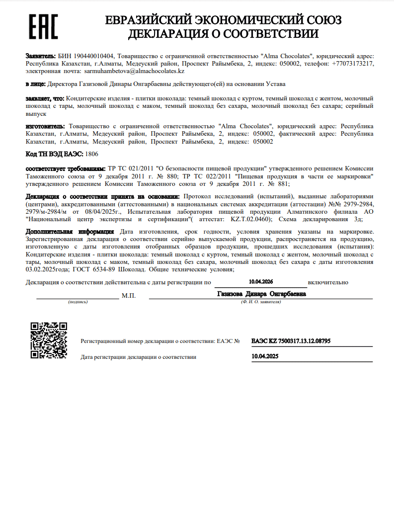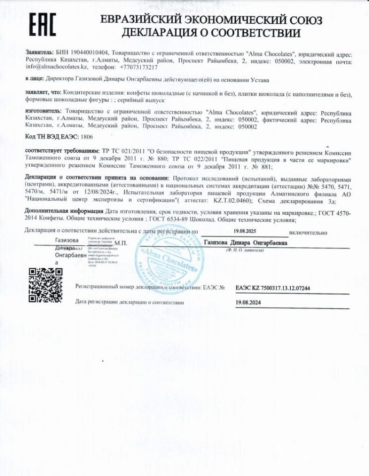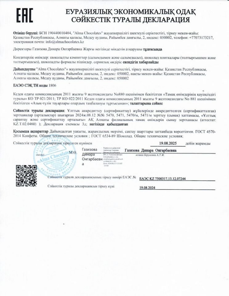 Alma Chocolates™ is a factory for the production and supply of chocolate products. Our company produces a line of chocolate under its own brand and with national flavor “Nomad’s Sweets” and “Big Kazakhstan”, which have become a symbol of quality and hospitality of Kazakhstan. The products have an original recipe and have been produced in Almaty since 2015. In addition to the line of chocolate bars under our own brand, we produce branded products, bars and figurines to order with a logo and in the corporate style of the customer.